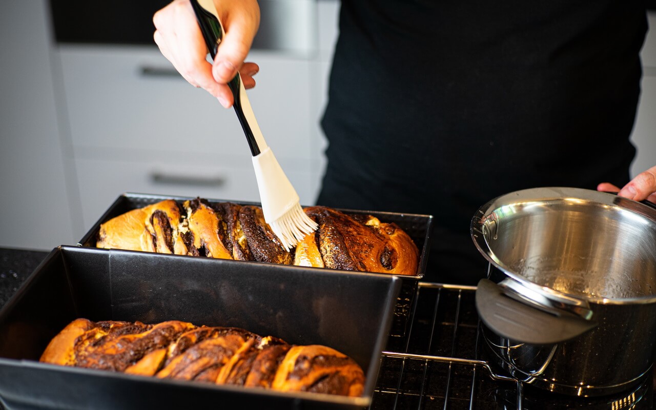 You will need at least one loaf pan of 23 x 10 cm. Two loaf pans are recommended so you can bake both chocolate babkas at once. Besides that you can have a look at our should have baking tools for more helpers in your kitchen.