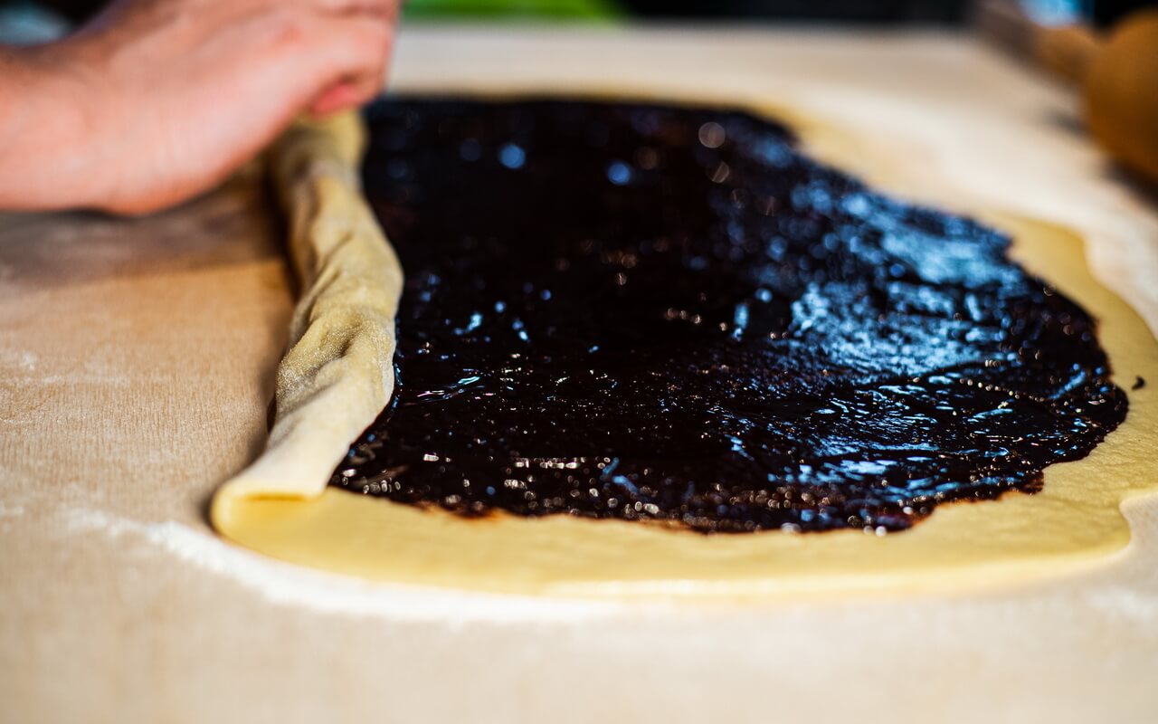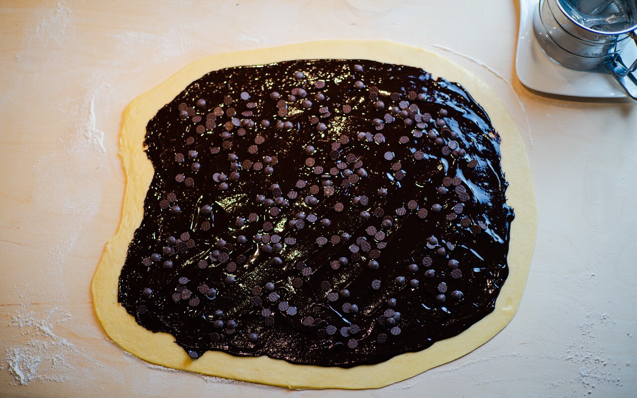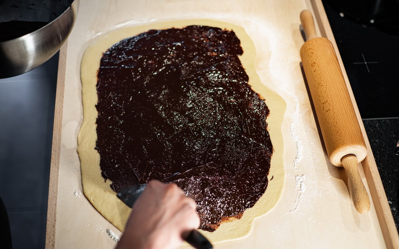 - Spread half of the chocolate filling on the dough leaving a 2 cm border all around