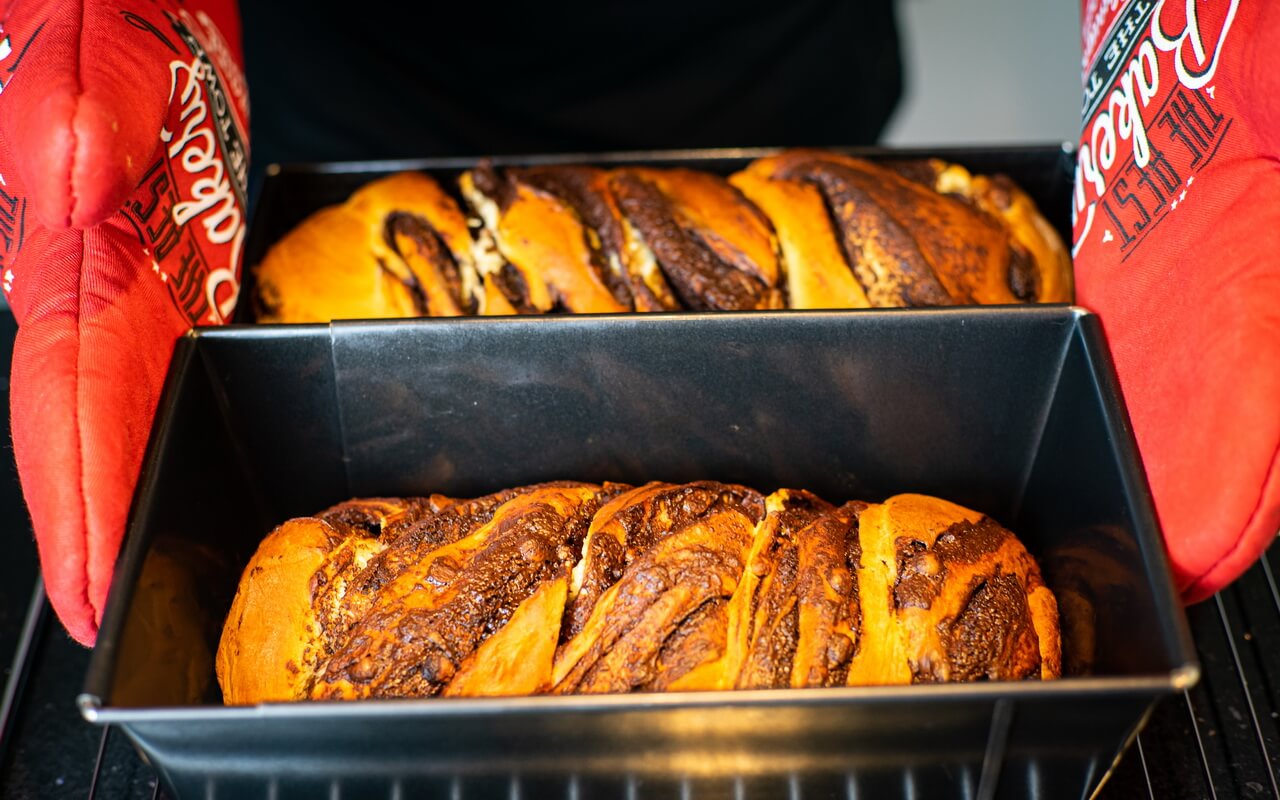 - After baking take your finished chocolate babkas out immediately, but keep them in the loaf pans