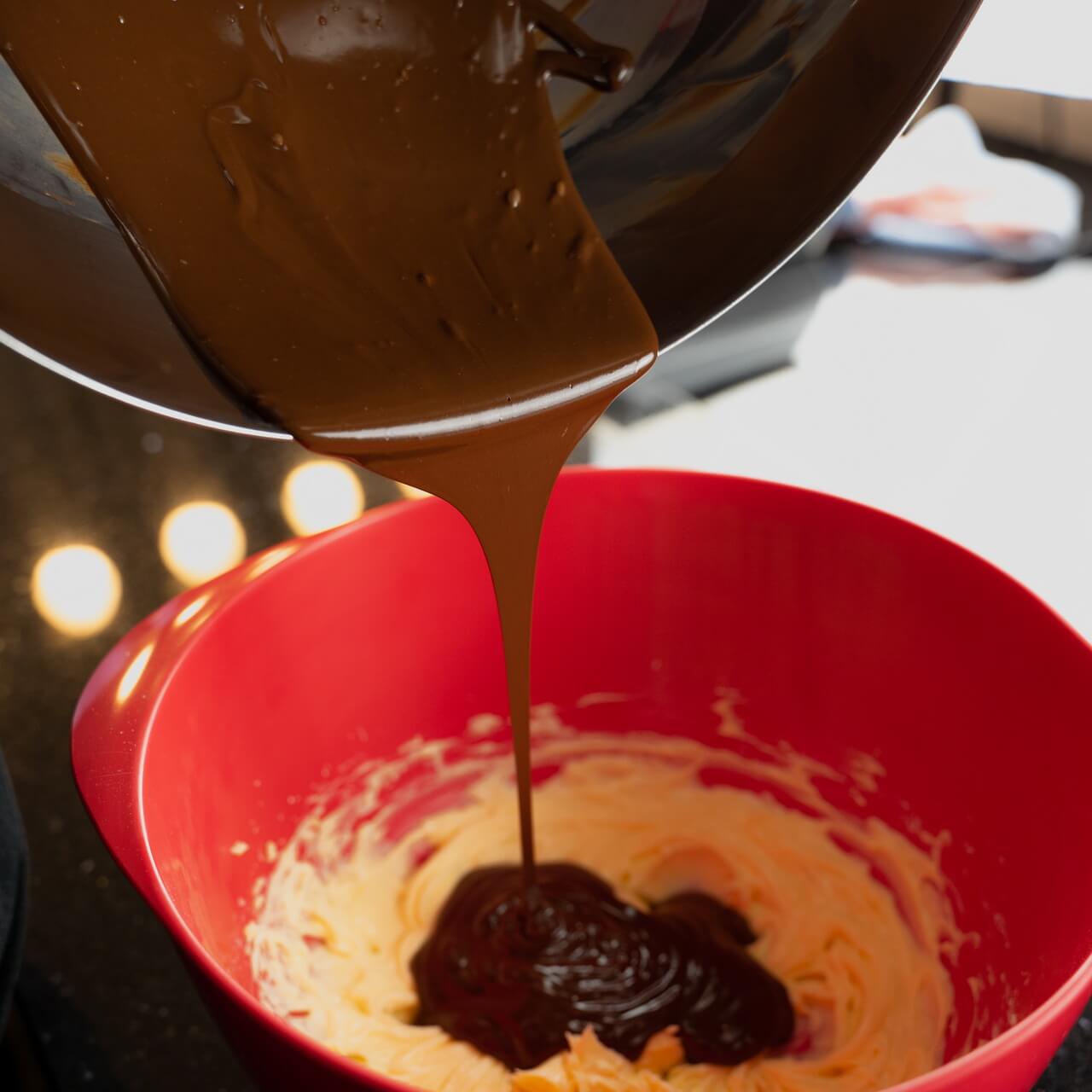 - Add the melted couverture chocolates and mix until fully combined