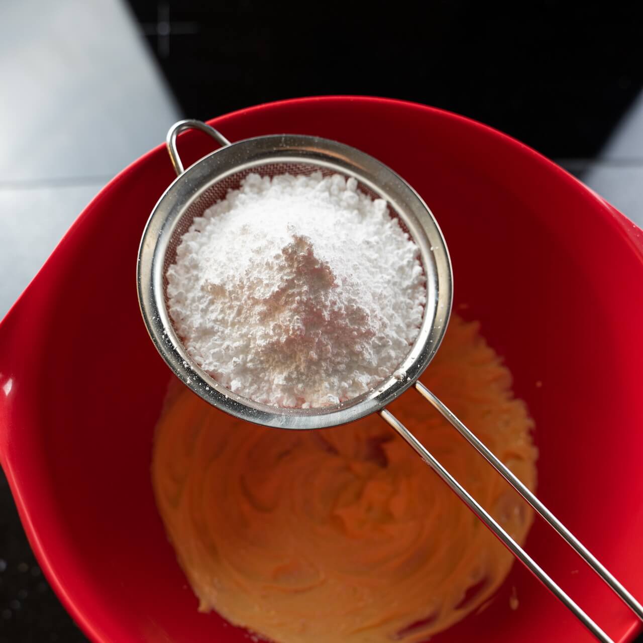 - Sift in the powdered sugar and mix further