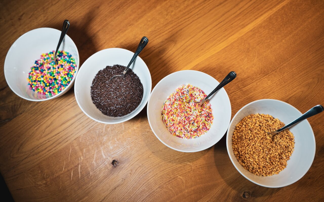 We have used crispy sugar pearls, coloured and chocolate sprinkles, brittle and sugar glaze.