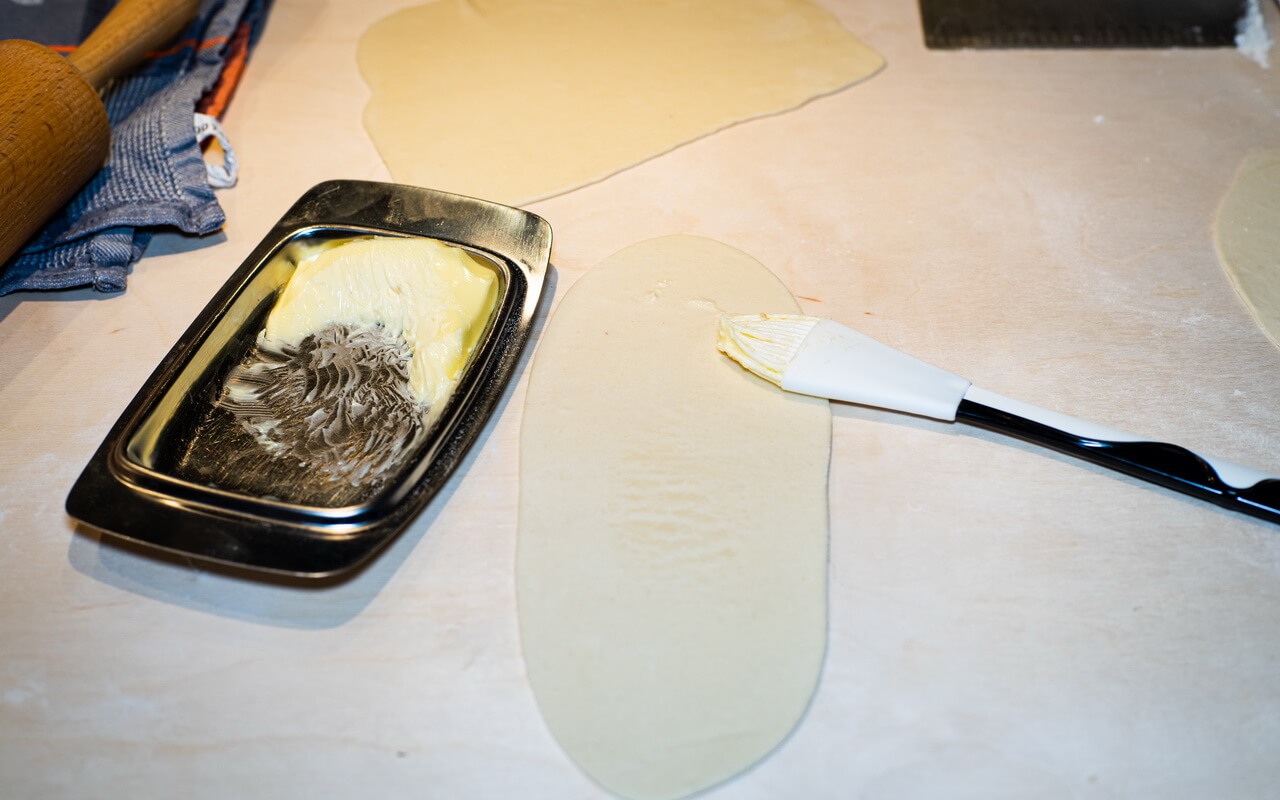 - Roll the dough out to an oval shape with the longer side away from you