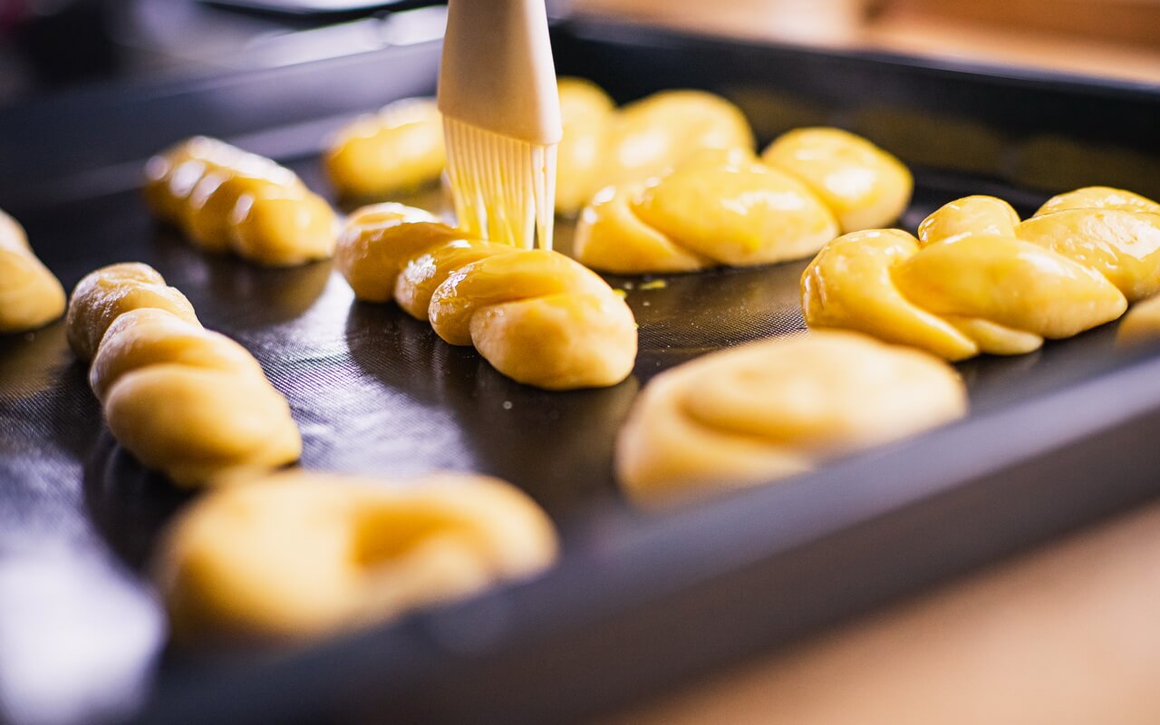 - Create an egg wash by beating one egg with 5 g of water together in a bowl