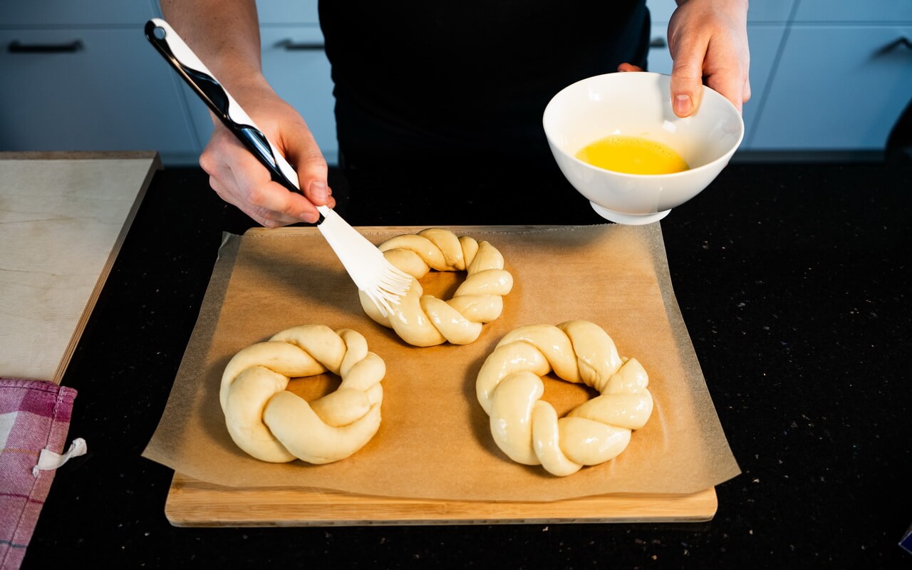 - Carefully brush the egg wash on top and sides of the wreaths so almost nothing drips on the parchment paper