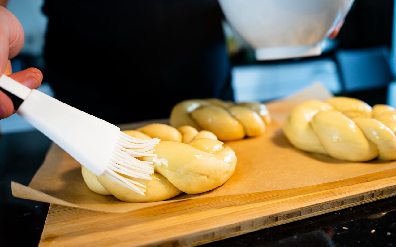 - Create an egg wash by beating one egg and 15 g of water together in a bowl