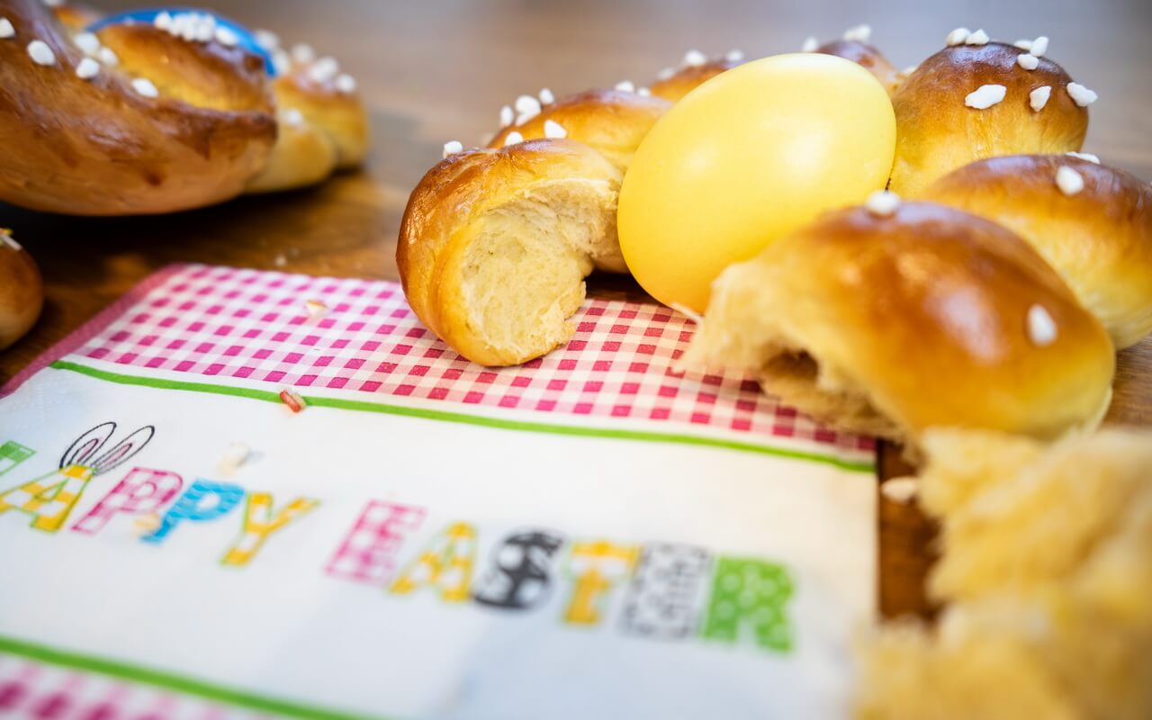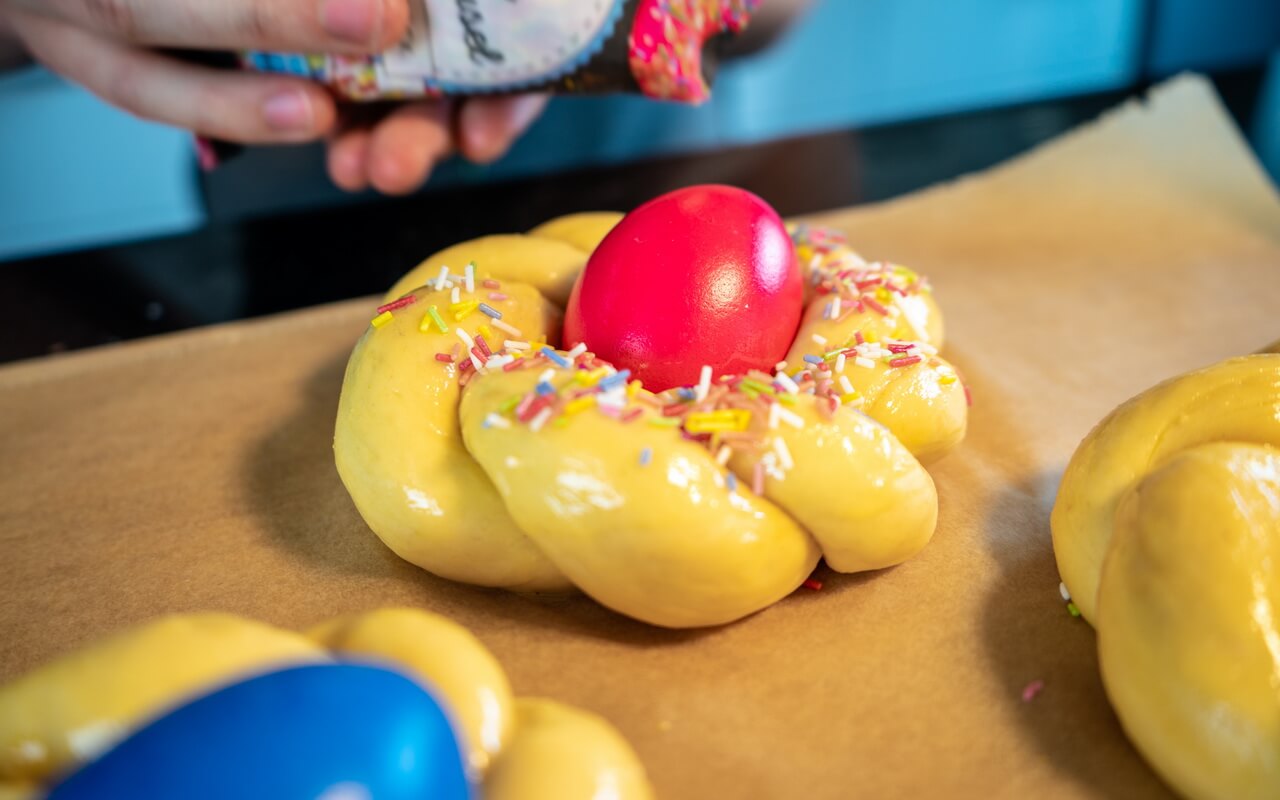 Pane Di Pasqua taste best straight out of the oven when they are still warm. They are delicious on the next day too but we recommend you enjoy them on the first day as the flavour is the strongest then. We decorated ours with coarse sugar and candy sprinkles. Also, the dyed and hard-boiled eggs don’t only look pretty, they also fit to the Italian Easter bread pretty well.