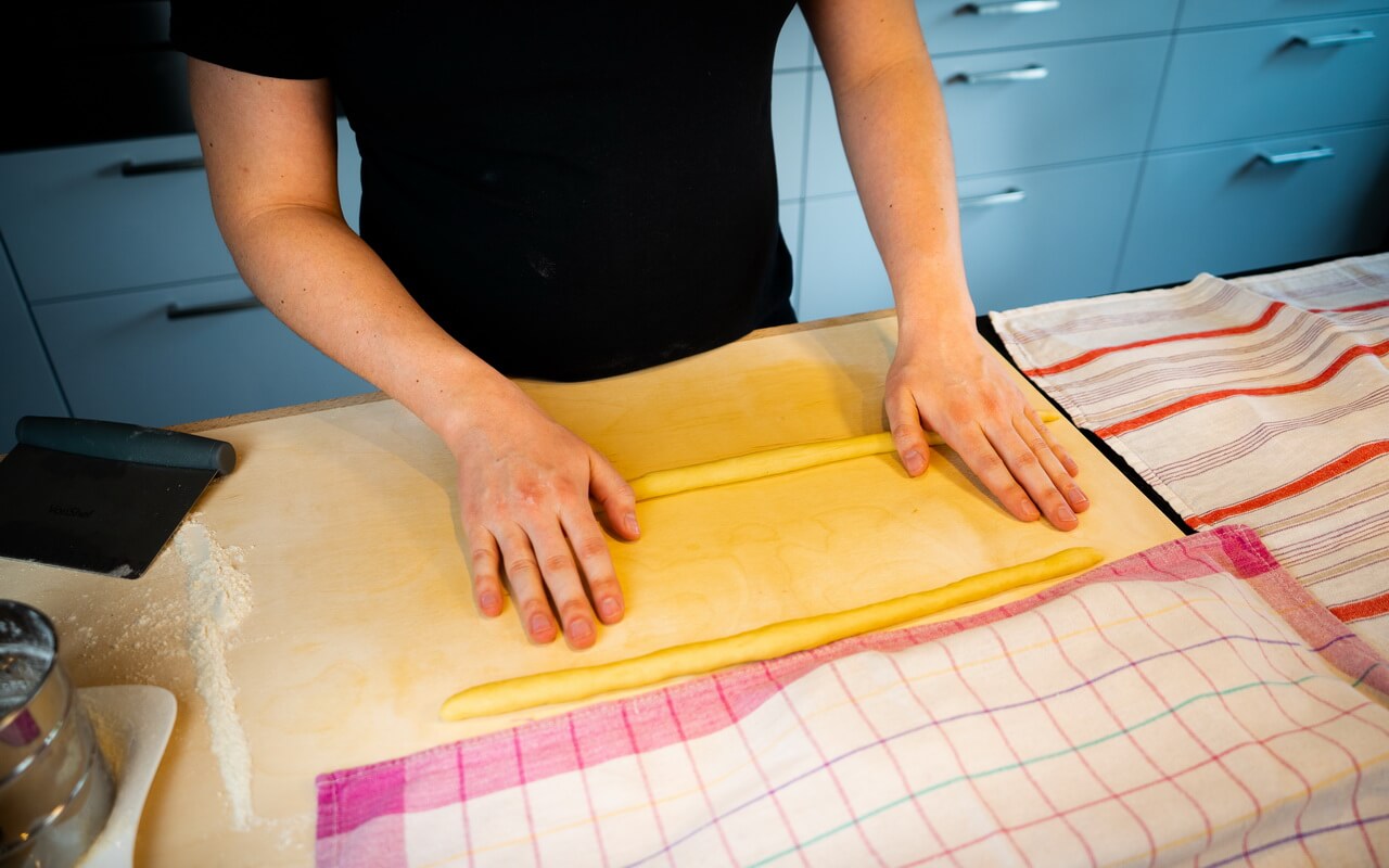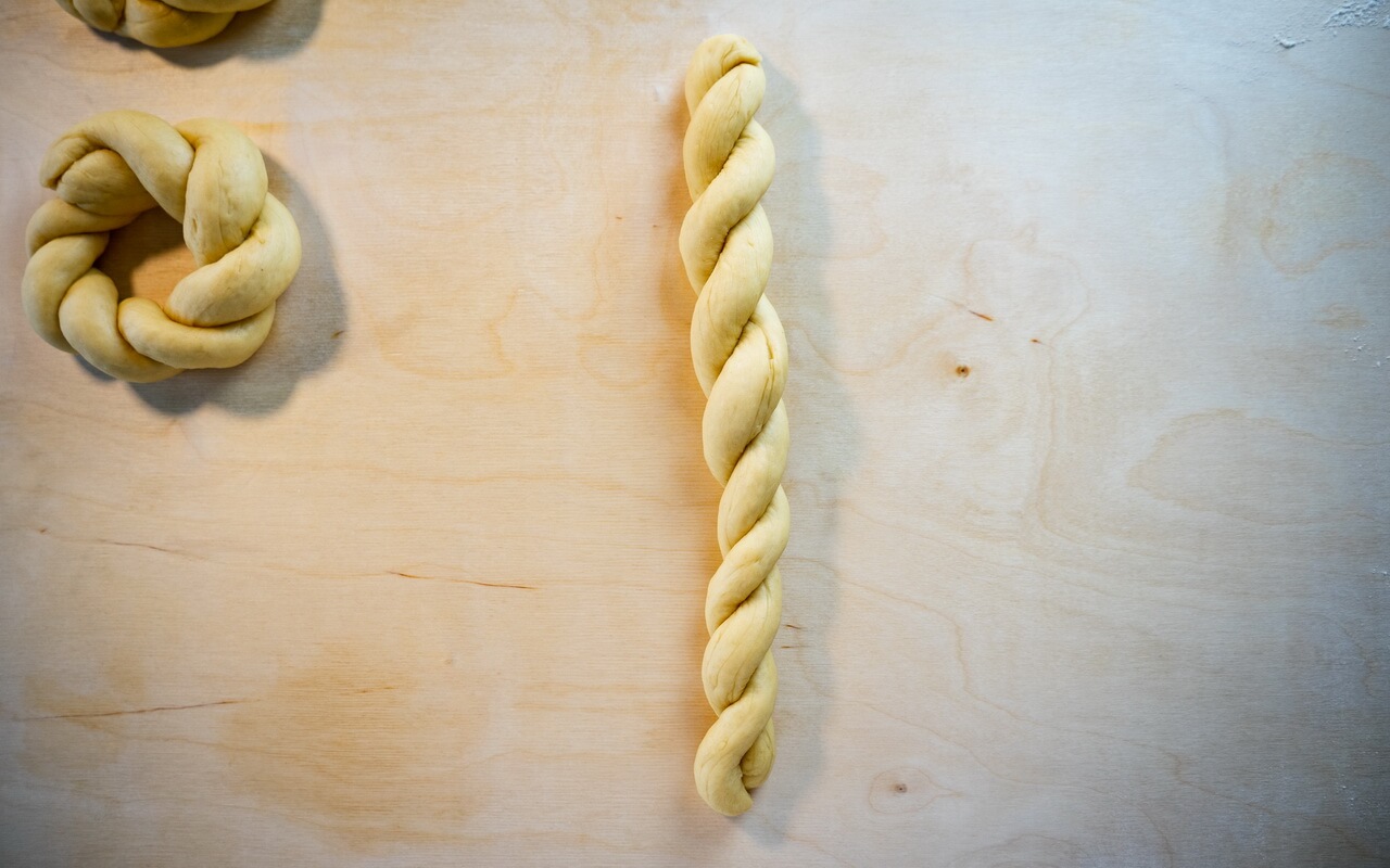 - Take two dough balls and roll each one to a cord of 35 to 40 cm