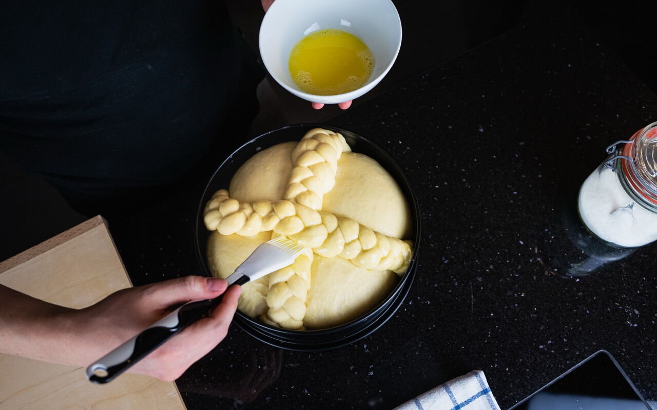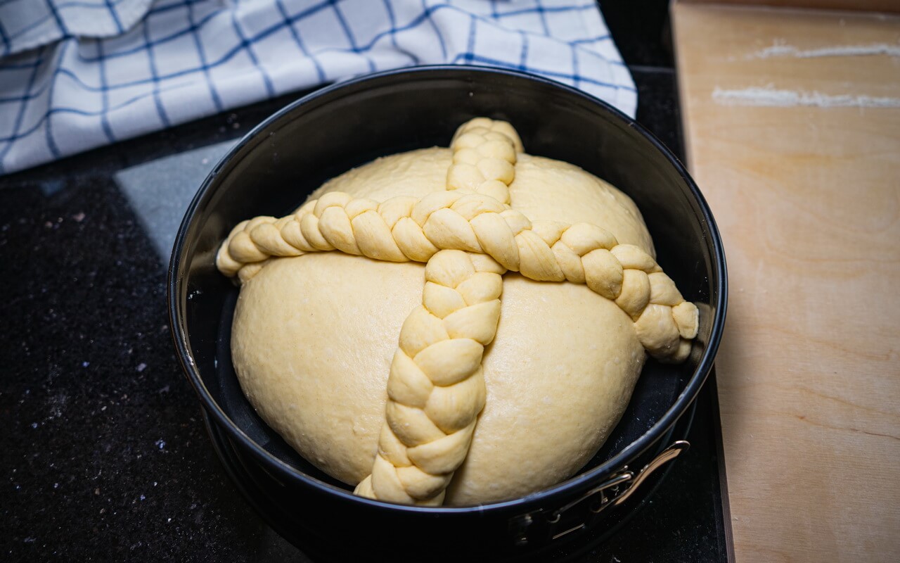 It has a fine crust of sugar on top which just rounds up the full and rich taste. The braided cross on top gives it a special look but you could as well only shape it as a loaf – just create it as you like or can.