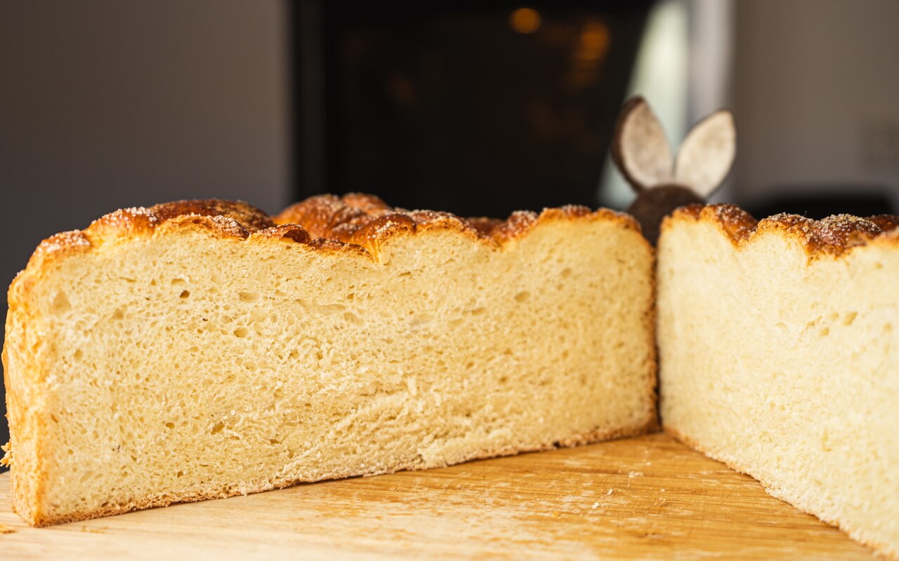 This Paska – traditional Slovak Easter bread is so nicely soft and fluffy with a slight sweetness. Despite the high amount of used yeast for the dough you can barely taste it.