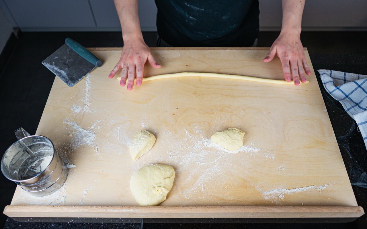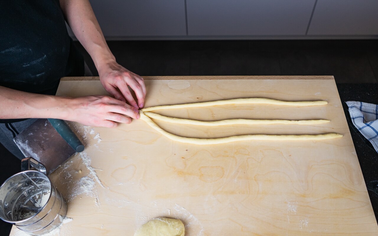 - Take 3 dough balls and roll each one to a cord of 22 to 25 cm