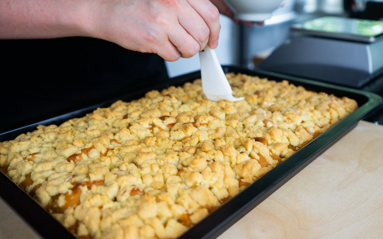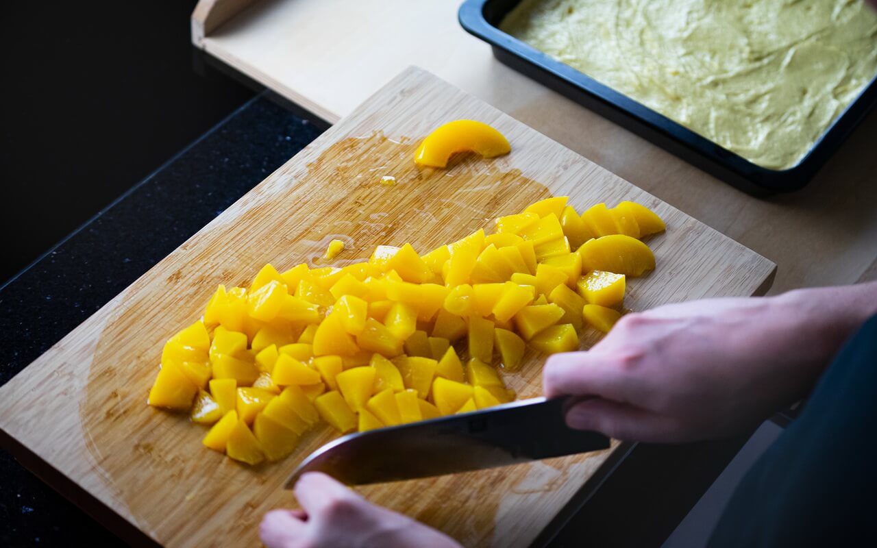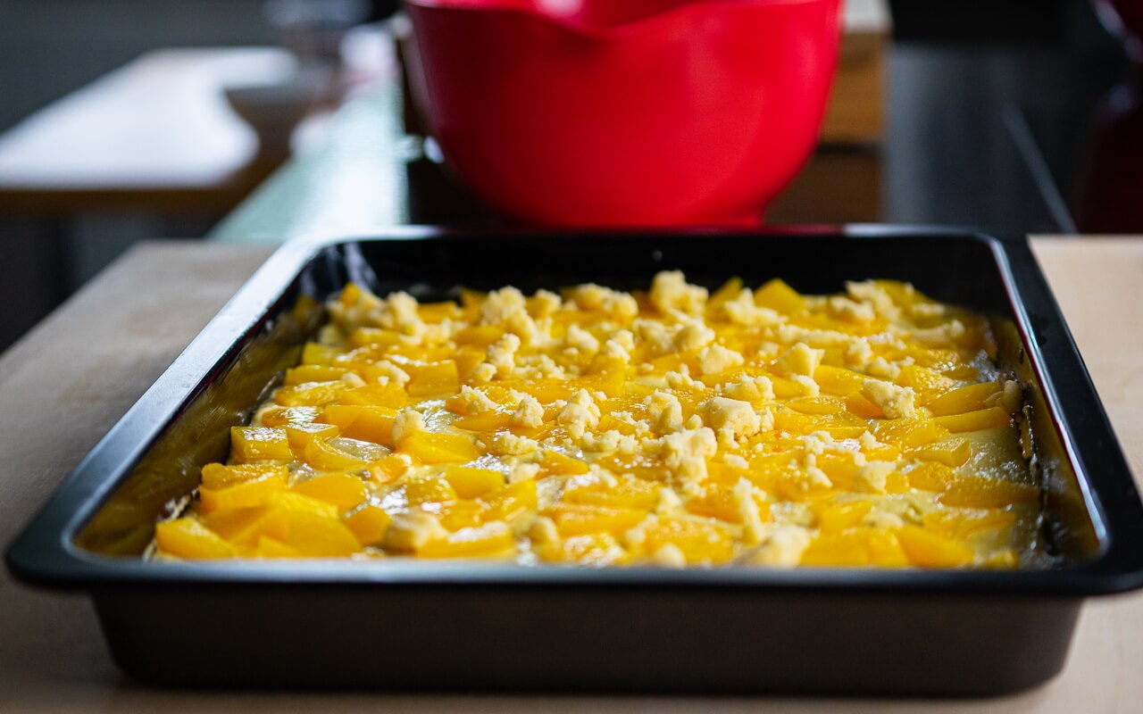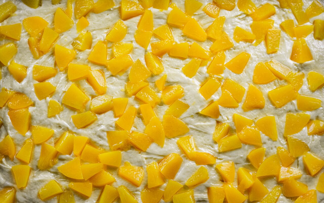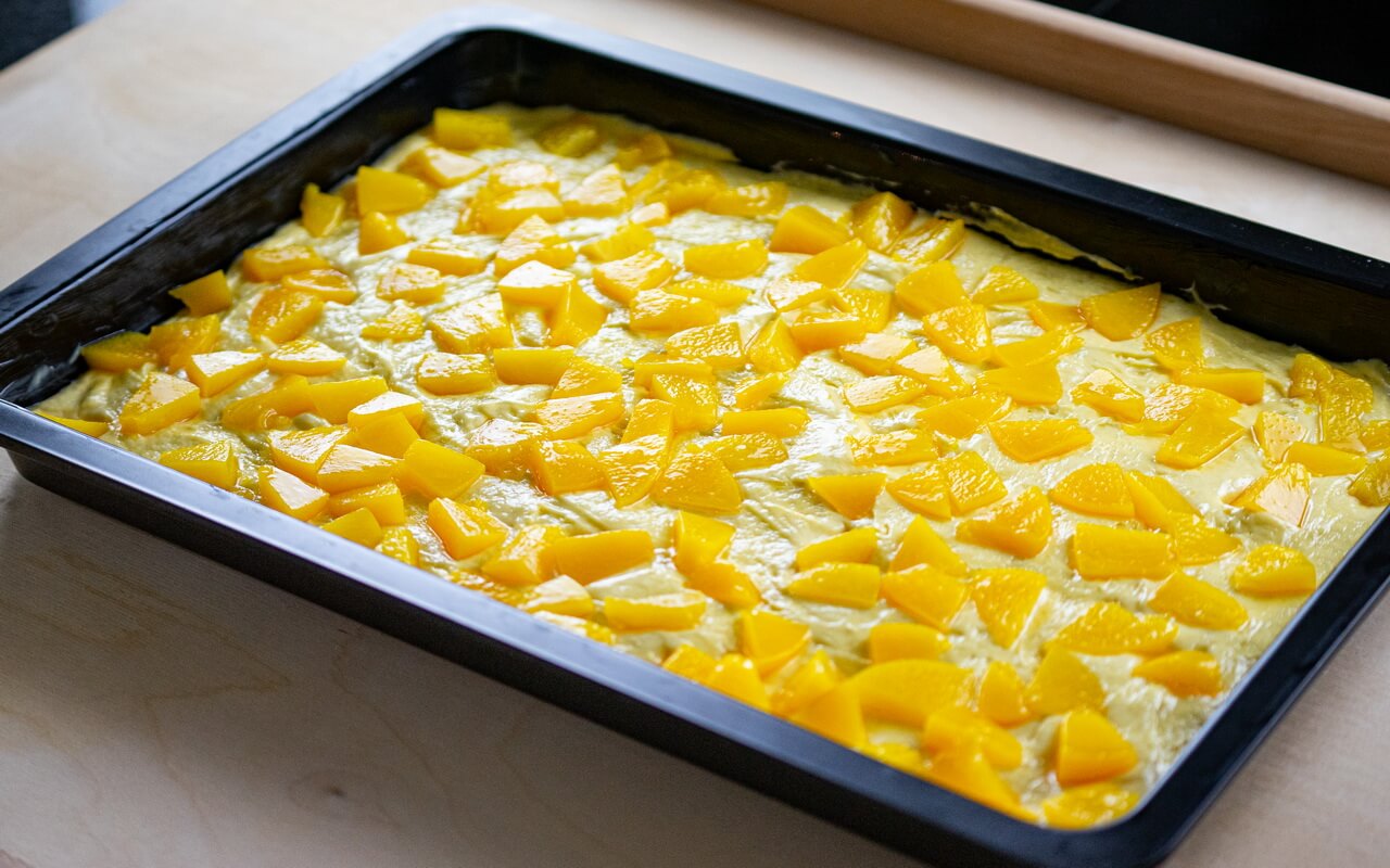 - Afterwards add the previously cut peaches and carefully fold them in or wait until the dough is in the baking pan and then sprinkle them on top of it
