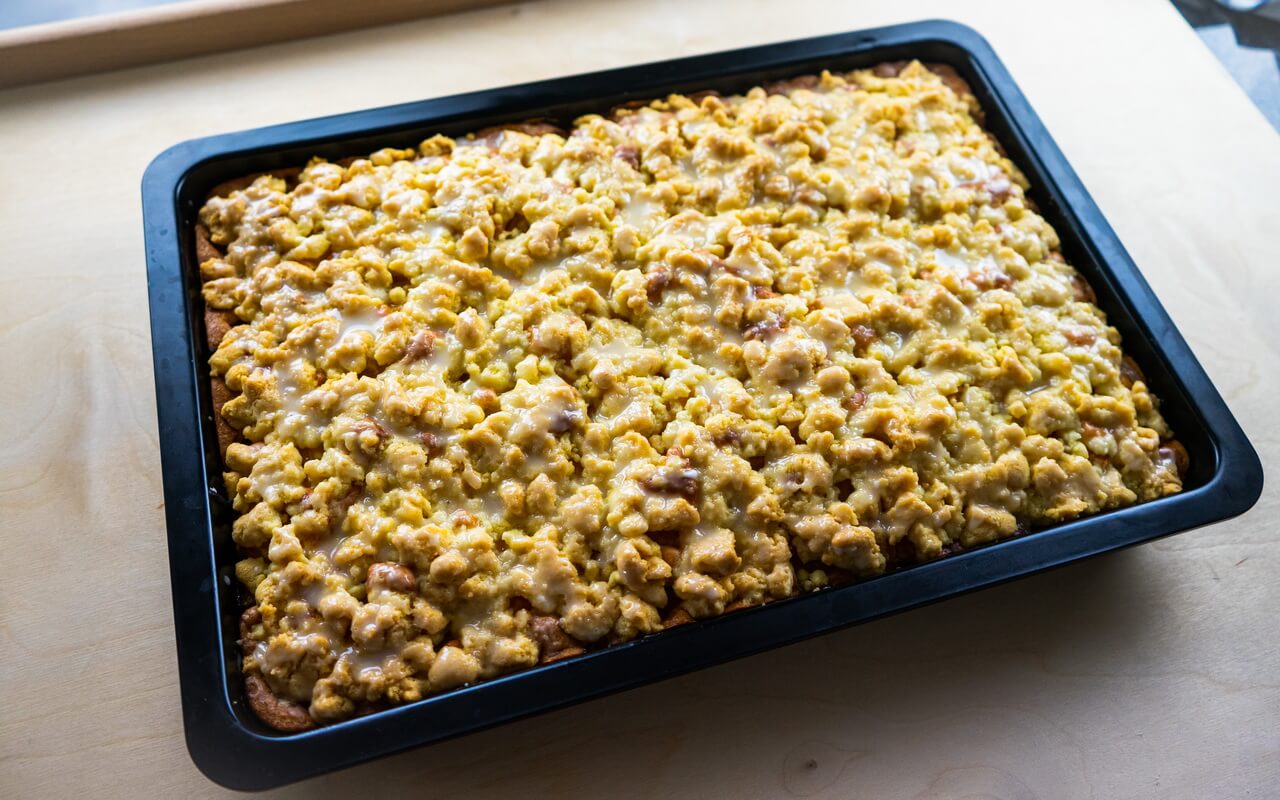 - Create streusel by taking the dough into your hand and crumbling it over the dough in the baking pan