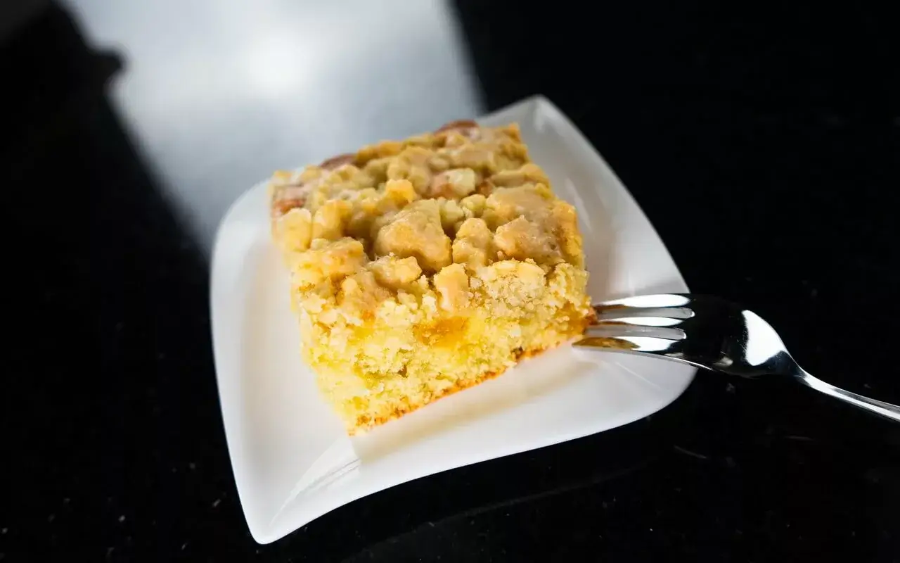 - After you get your preferred thickness pour the glaze over the peach streusel cake and spread it evenly