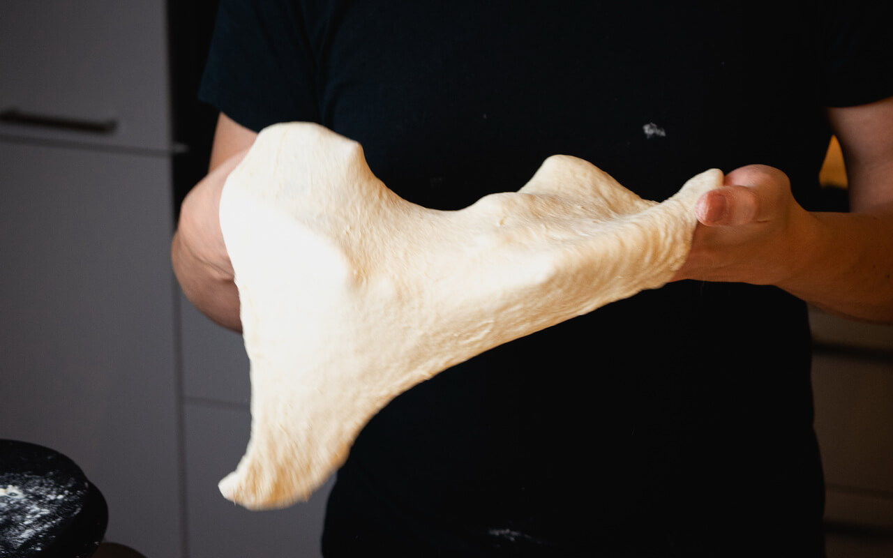 - Tip: If the dough starts sticking to the surface or your hands, add a little flour on top of the dough, flip it to the other side, add a little flour on top and start stretching it out further