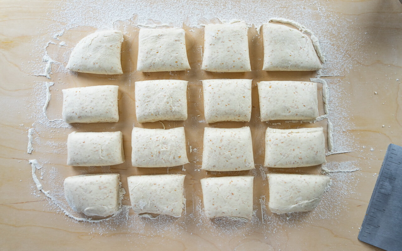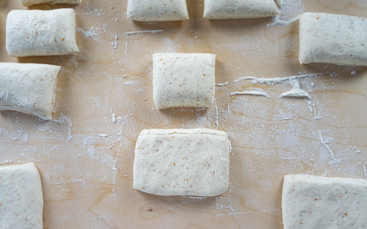 - Try to get each dough piece into a rectangular shape and press it down a bit