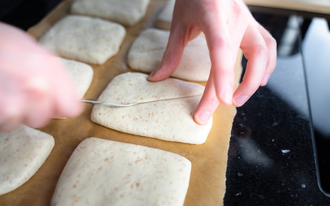 - With a bread lame make one diagonal cut (about 2 cm deep) on top of each dough piece