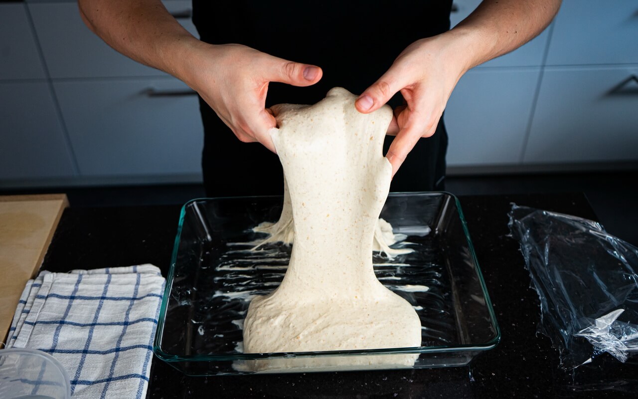 - During that time stretch & fold the dough every 30 minutes (6 times in total) and after the 6th time let it ferment further for 2 more hours until 5 hours in total are reached