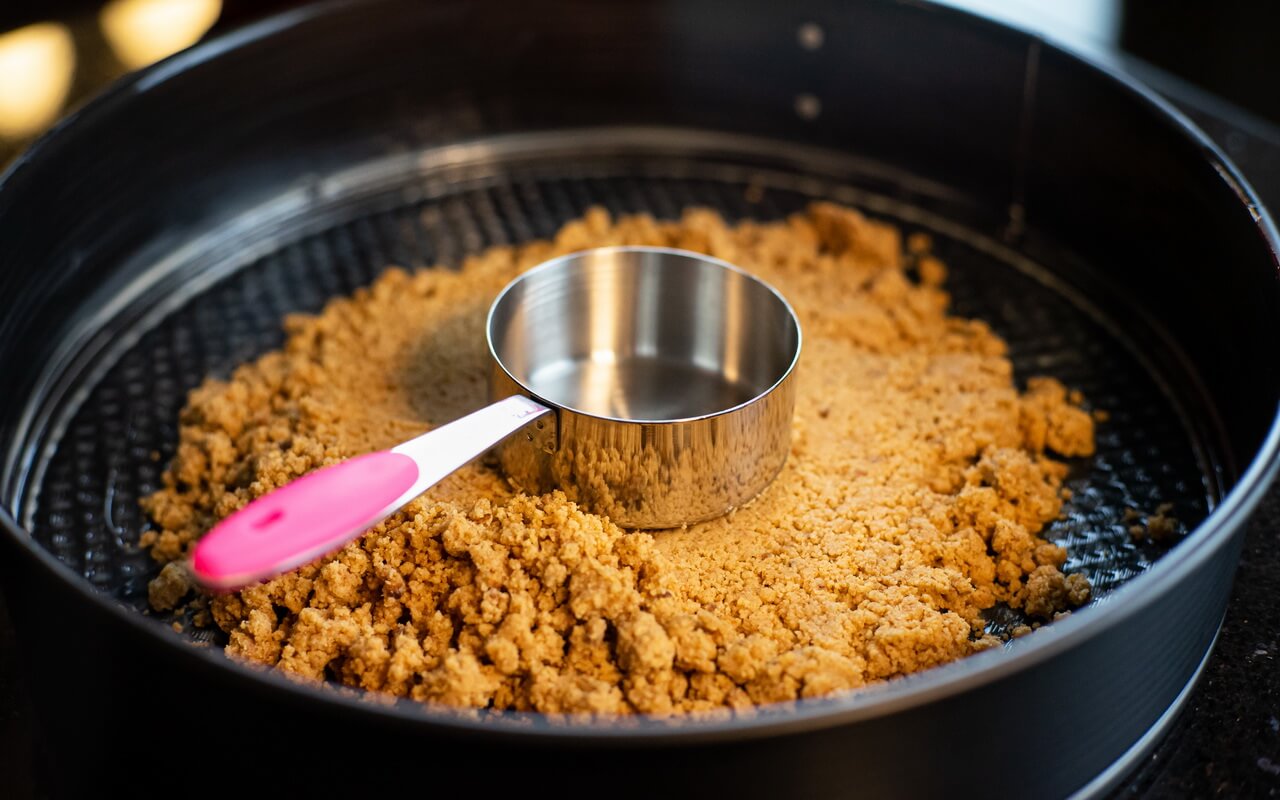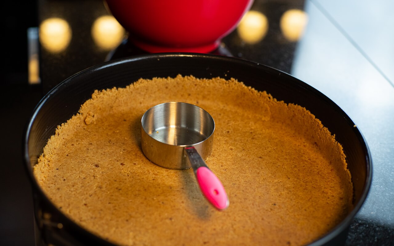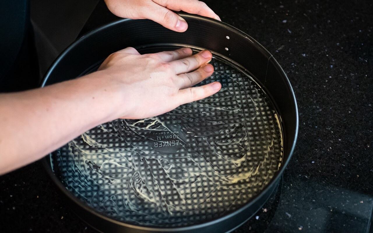 - Press the previously created dough into the bottom and up the sides of the springform pan very tightly