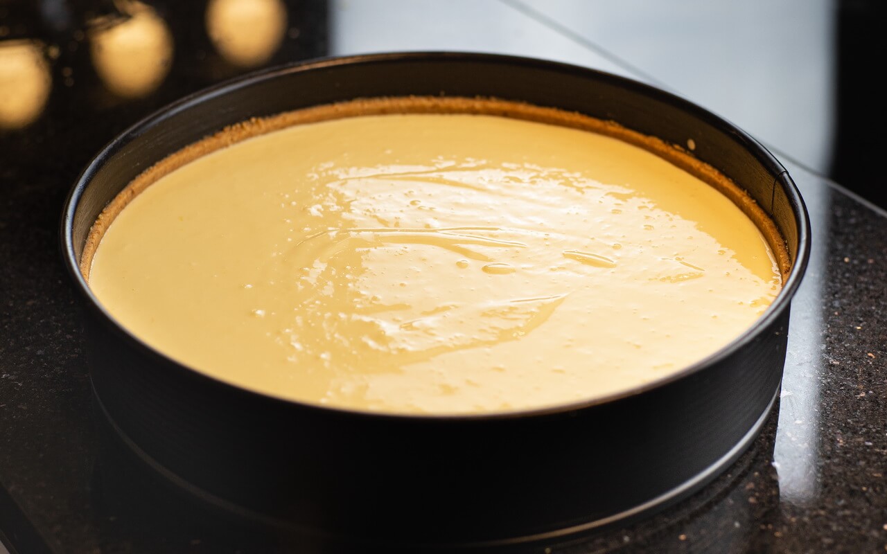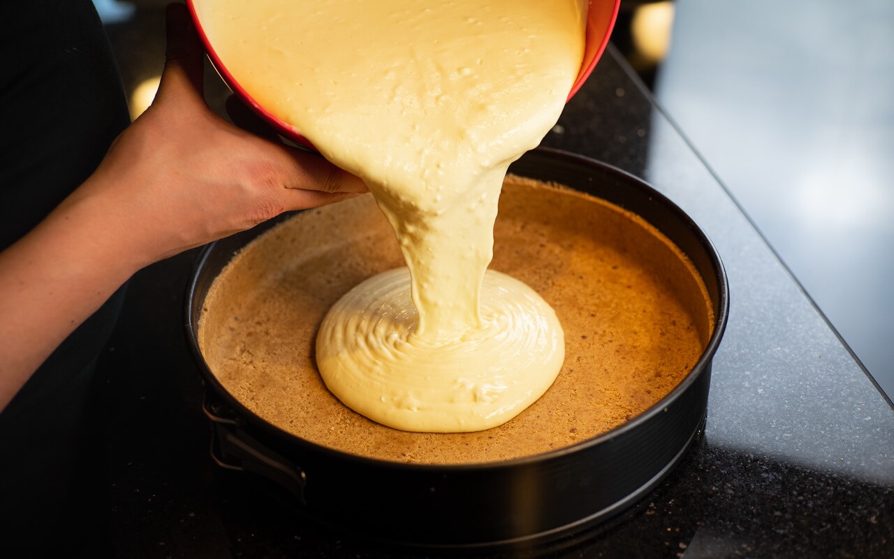 - As the last step, pour the whole mixture into the coated springform pan