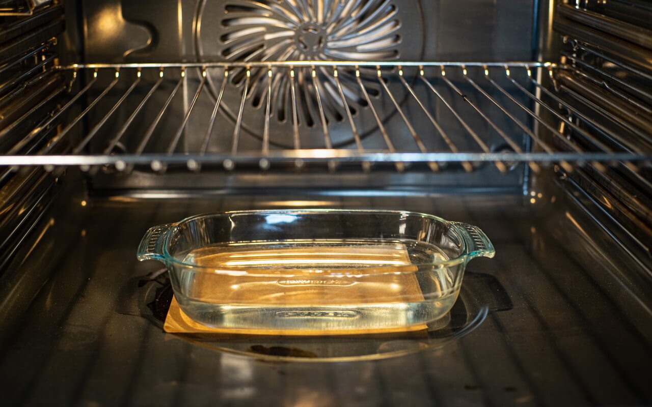 - Put a bowl with about 500 g water on the bottom of the oven and a baking grill in the middle