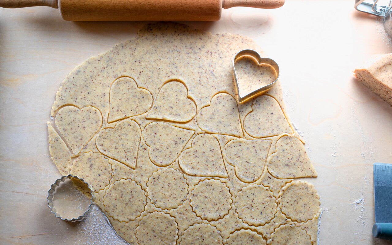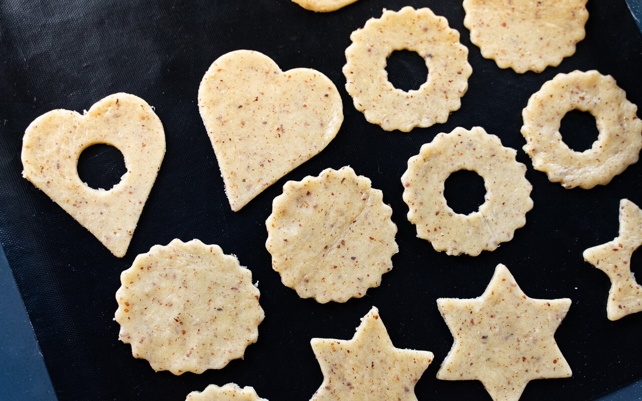 You are good to go with a hand mixer, bowl, rolling pin, 2 baking plates (1 is also fine), parchment paper, cling film and of course cookie cutters. We used the classic round, star and heart shaped cookie cutters.