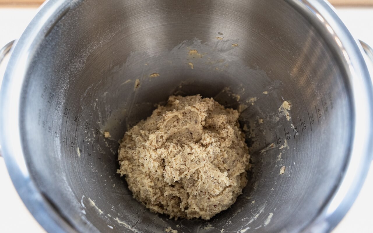 - While mixing, add the cold butter in smaller chunks and mix until fully combined (about 5 minutes)