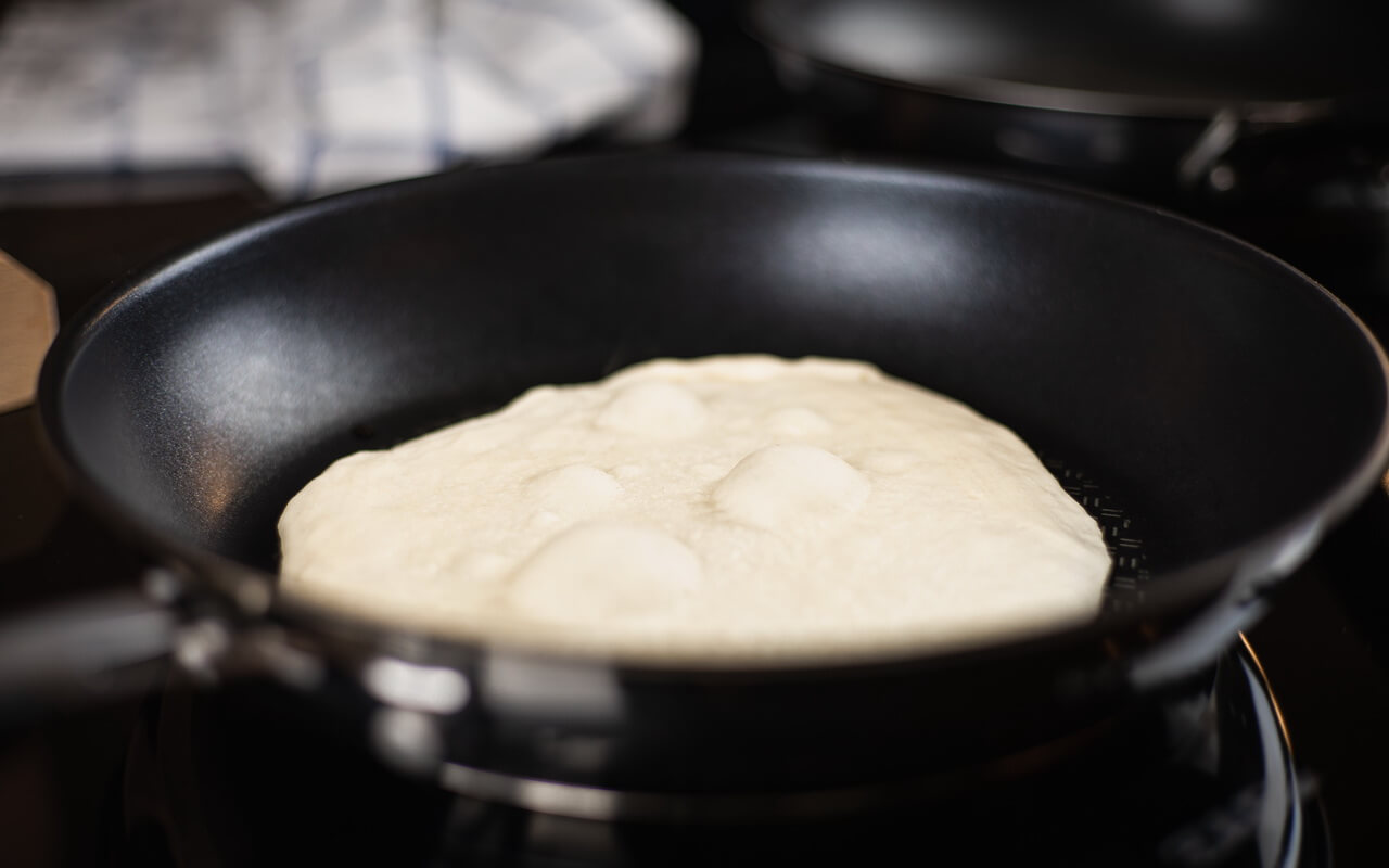 - Place one dough circle into the pan and allow to cook for about 1 minute or until the bottom surface has a few pale brown spots and the uncooked surface is bubbly